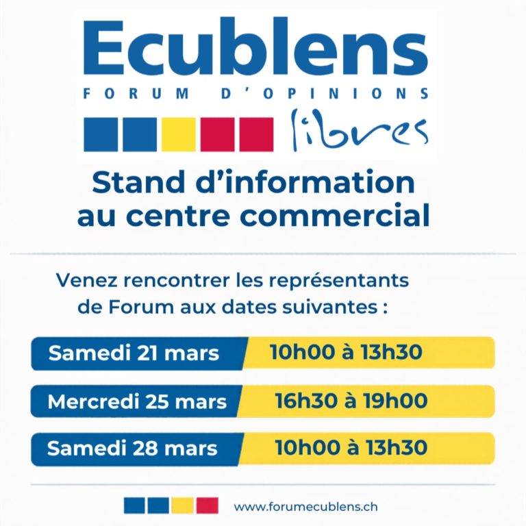 - Samedi 21 mars, 10h-13h30 – Stand Forum, Centre Commercial, devant Coop