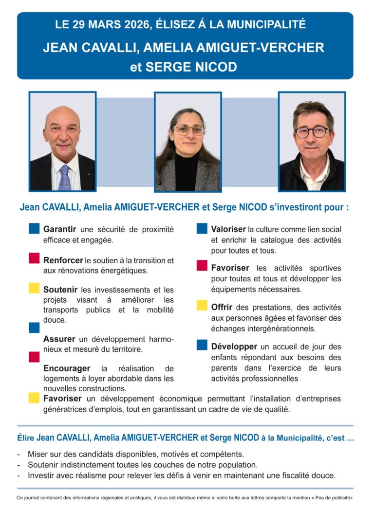 Le 29 mars 2026, au 2ème tour des Municipales, soutenez nos candidats: Jean Cavalli, Amelia Amiguet et Serge Nicod. Lisez notre Journal no 18 >ici et notre Communiqué de presse >ici